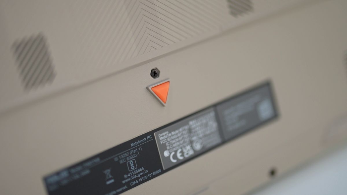 The chassis barely has almost no flex, and that's thanks to a clever bit of design under the laptop. ASUS planted this orange triangular foot under the laptop to reduce the chassis flex, and slightly raise the laptop for better heat dissipation. The other rubber feet are also well-matched with the chassis colour so you'll not be able to tell which one is the rubber strip without touching it.