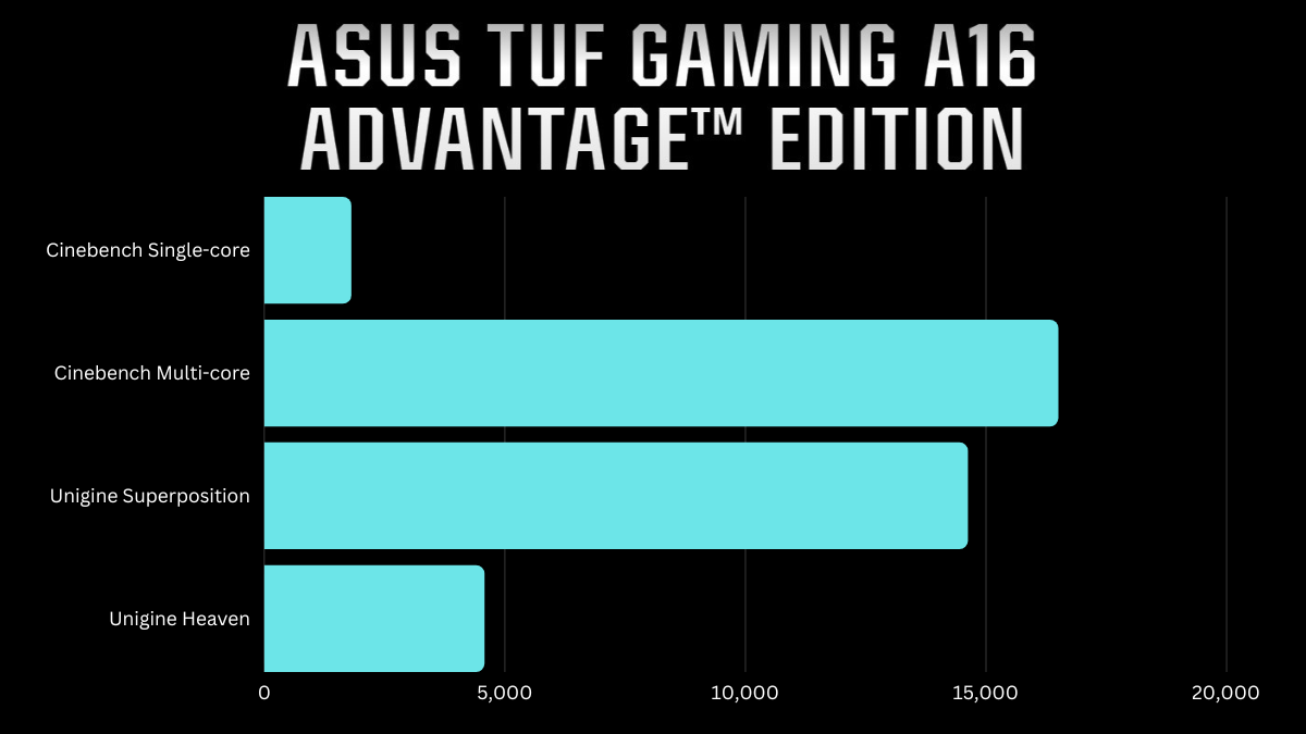 Ah, another gaming laptop I get to benchmark and be impressed with the scores. I mean benchmarks are great, but real-world performance and use leave different impressions. Benchmarks let you look into the soul of a machine, and the TUF A16 doesn't budge. I ran Cinebench single-core twice and then ran Heaven 4 on battery power, but there's no throttling or excess heat.