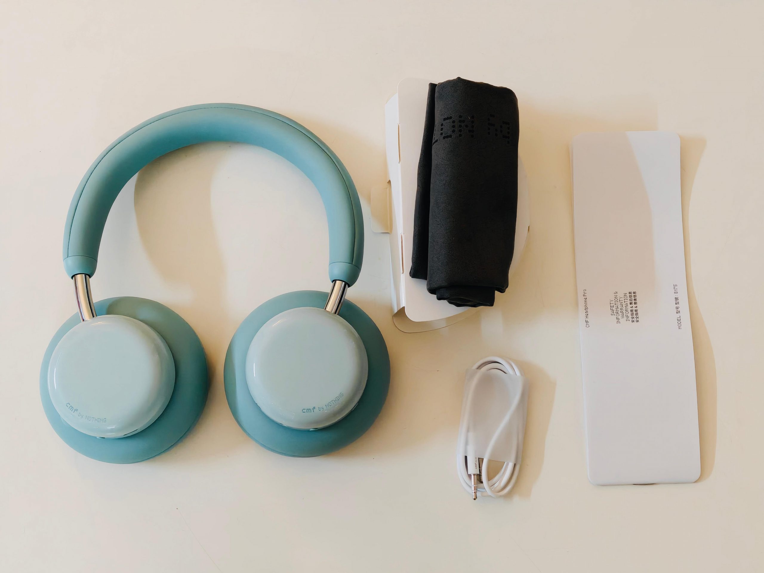 The box contents are limited yet useful. You receive CMF Headphone Pro in Light Green colour, carry pouch, AUX cable and user manual. Carry pouch is good for providing minimal security during travelling or when storing the headphones. The AUX cable also supports wired listening in case the battery dies, or you want to have the option of a wired connection. The user manual is a beginner's guide and contains first time set-up.
