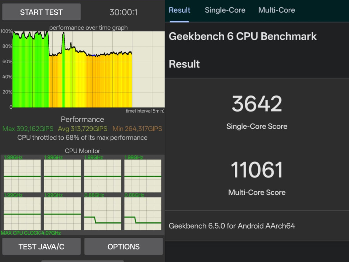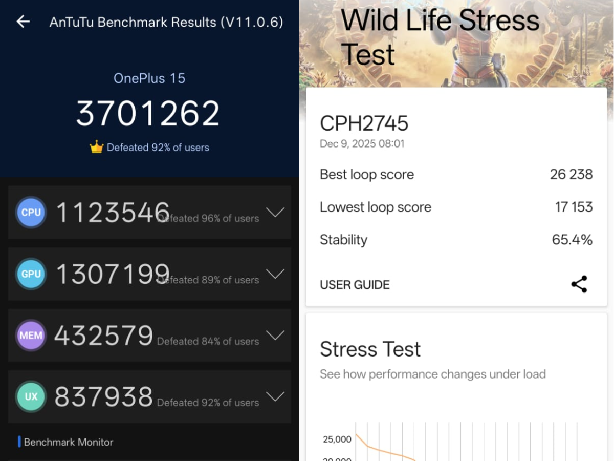 In benchmark testing, too, the OnePlus 15 mirrors real-life usage. It delivered a single-core score of 3,642 and a multi-core score of 11,061 on Geekbench 6. On AnTuTu, the device crossed an impressive 3,701,262 points, beating the iQOO 15 in the benchmark scores. In the CPU throttling test, the phone retained around 68 percent of its peak performance.