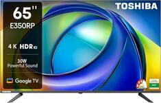 The Toshiba 65E350RP is a 65‑inch 4K UHD Smart LED TV featuring a resolution of 3840×2160 with a Direct‑LED back‑light and a 60 Hz refresh rate. It boasts approx. 350 nits brightness, HDR10/HDR10+ support and wide 178° viewing angles. Audio comes via two speakers delivering a combined 30 W output with Dolby Atmos support. Connectivity includes 2 HDMI ports, 2 USB ports, a headphone/audio jack and RF input. Smart functionality uses Google TV, offering WiFi (2.4/5 GHz), Bluetooth, Ethernet, screen‑mirroring, and apps like Netflix & YouTube.  Dimensions with stand are approx. 1446 (W) × 912.7 (H) × 285 (D) mm, weight with stand is around 15.5 kg.