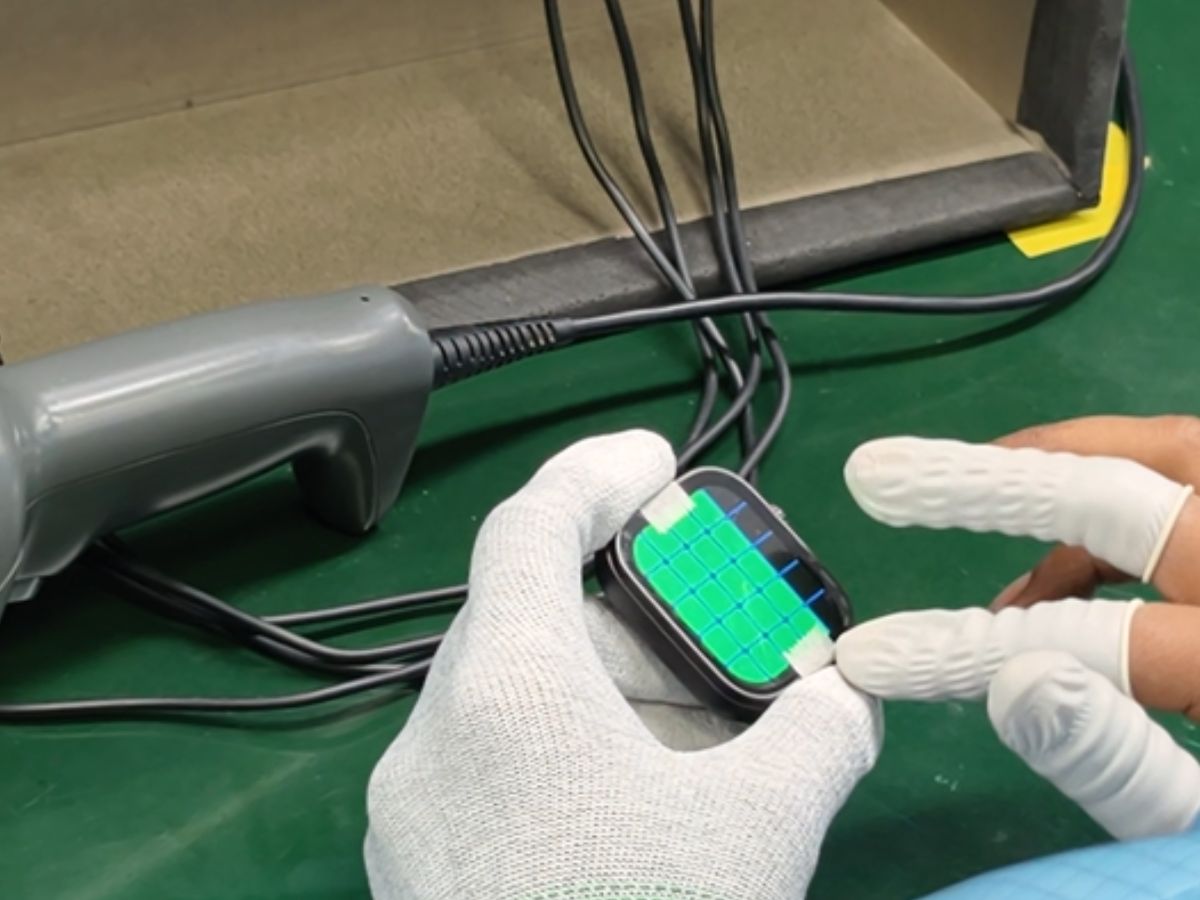 After the basic assembly of the PCB, battery, and sensors, the main display is attached, and it is tested to ensure that there are no issues. The worker at the station ran some RGB screens to check that the colours are tuned. In another test, the screen was sectioned into squares to check the touch response of the display. Then, the watch moves on to some essential stuff like adding the branding and printing the serial number on the watch's back. This process is called fibre laser printing, which can print in millimetre precision as well. This looks really fun and futuristic at the same time.